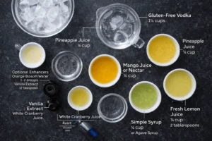 Step 2 — Mix the base In a pitcher or large cocktail shaker, combine vodka, pineapple juice, mango juice, lemon juice, and lime juice. Stir until fully blended.